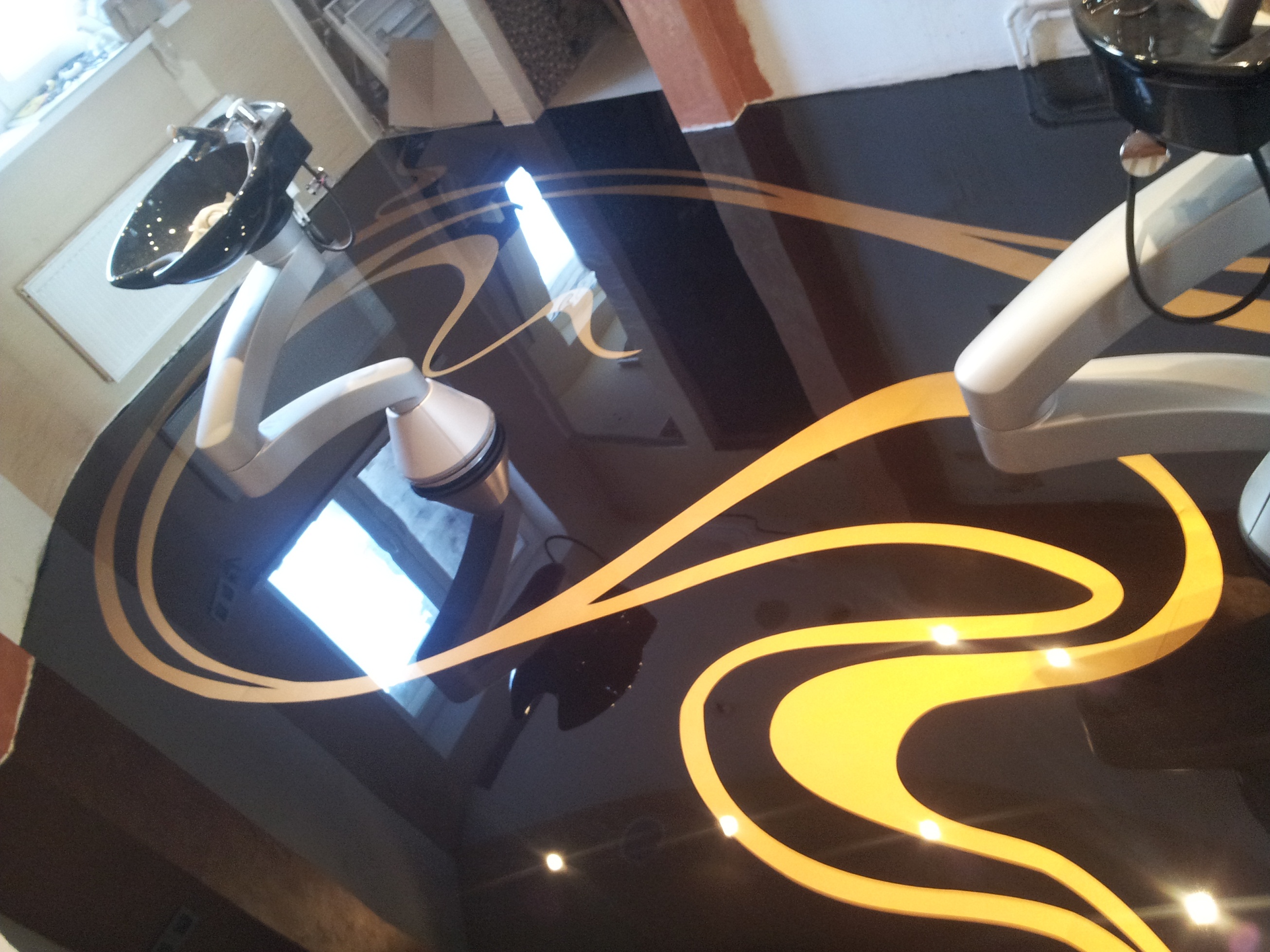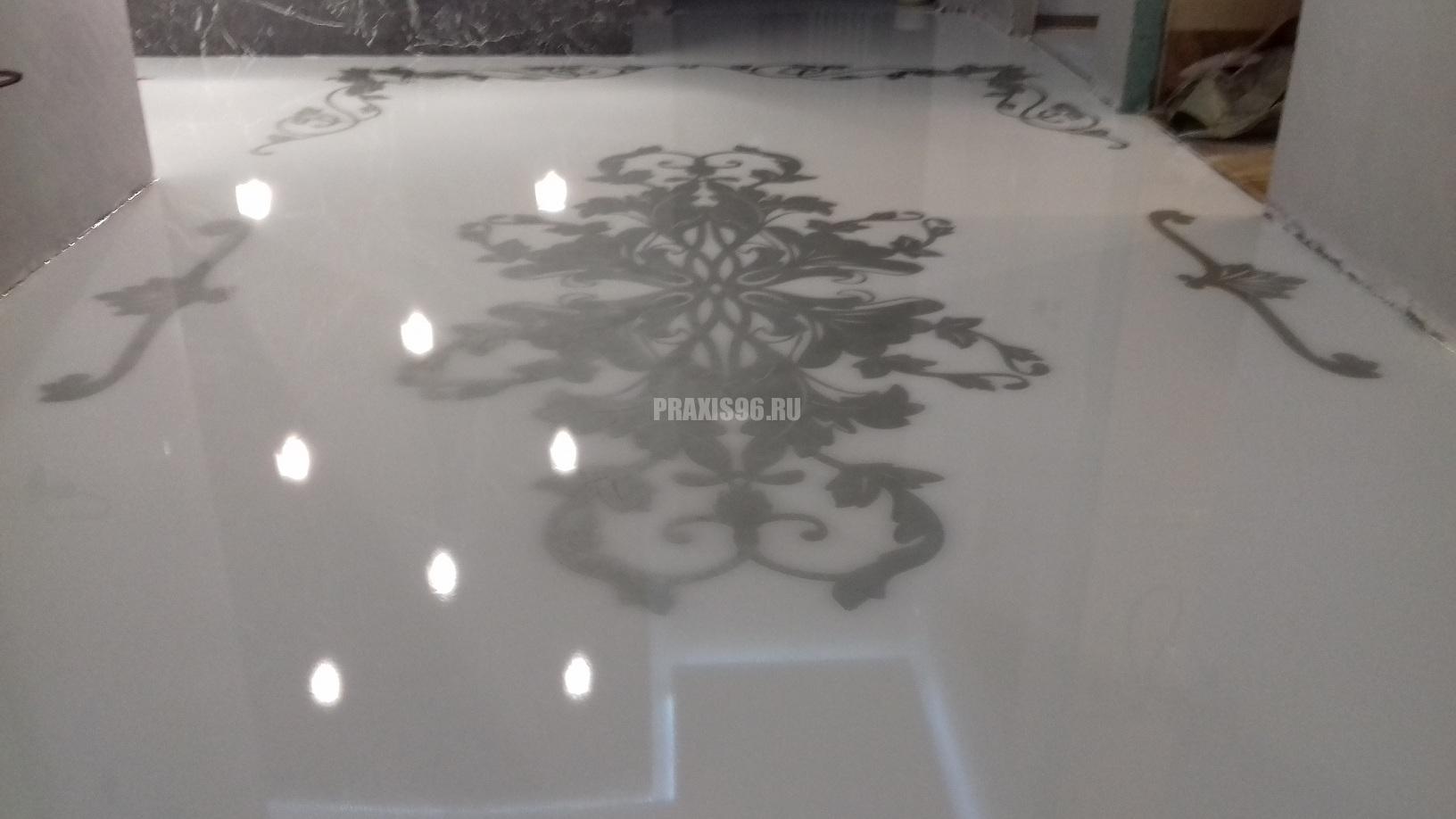 Белый глянцевый полимерный пол с узорами, стиль “современная классика”.Полимерный пол чистого белого цвета (ral 9010) с ярким глянцем.