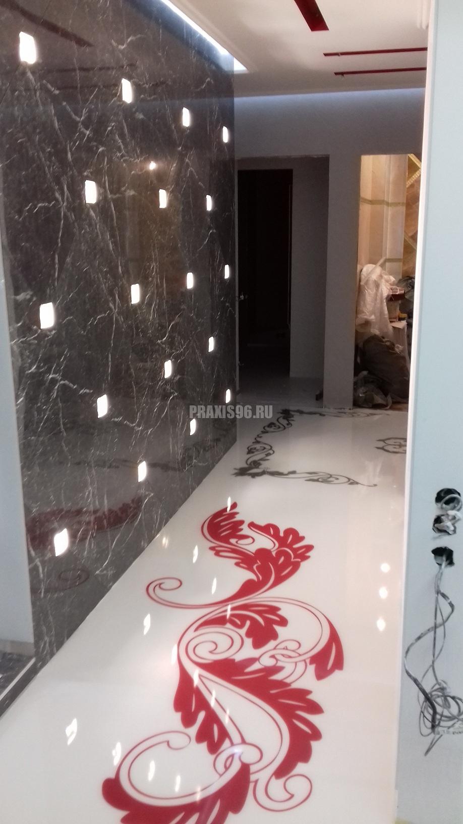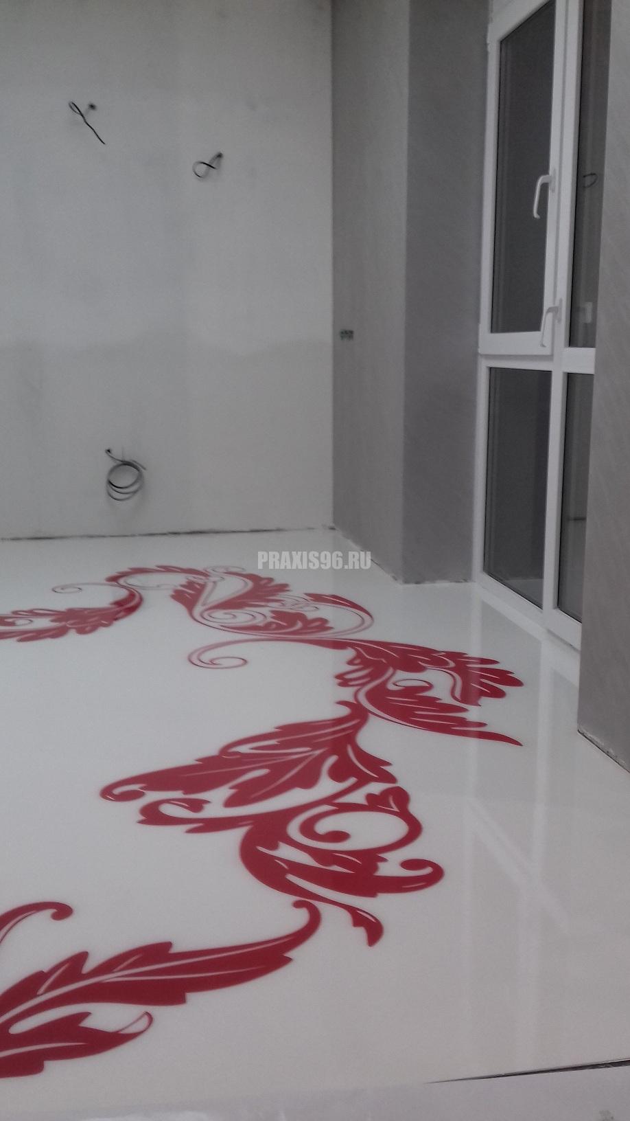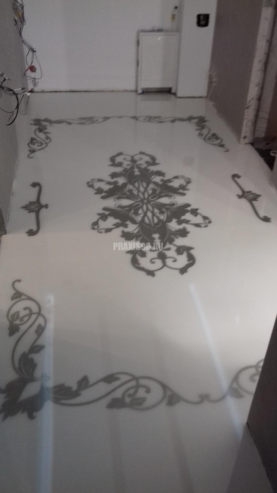 Белый глянцевый полимерный пол с узорами в квартире в ЖК “Родина”.