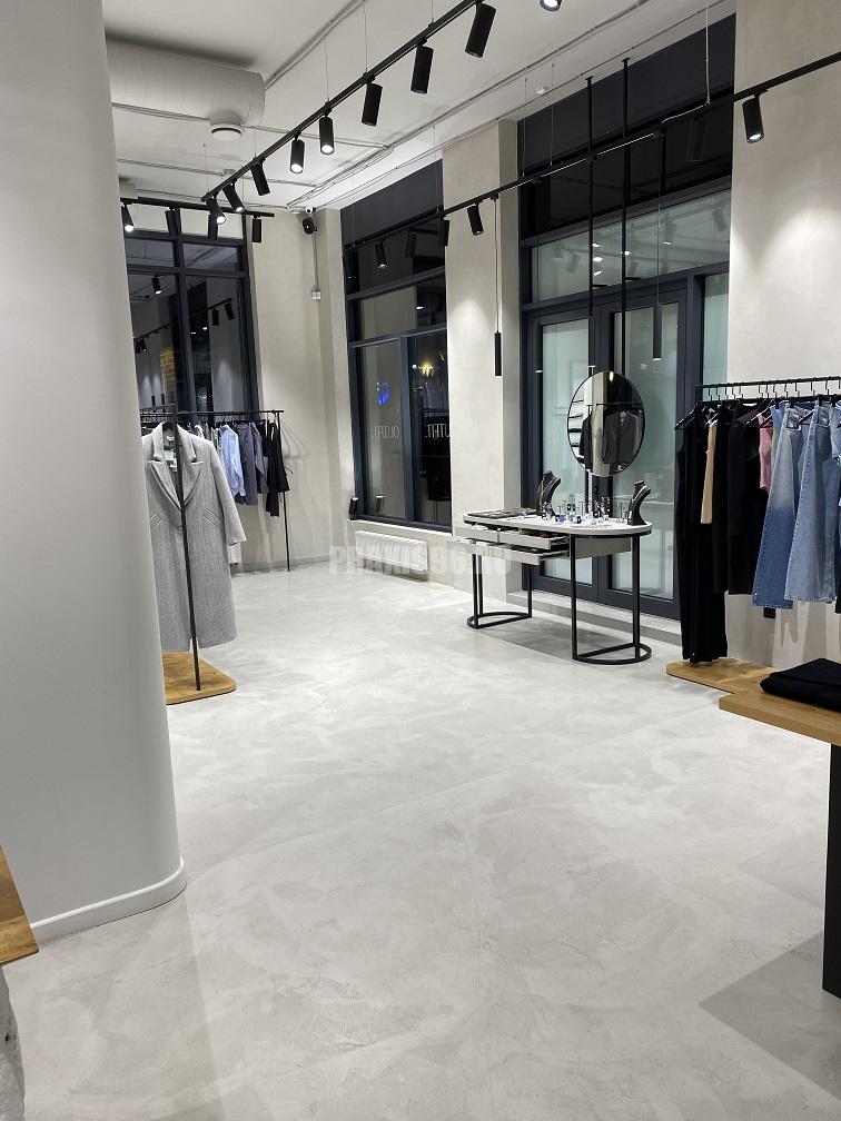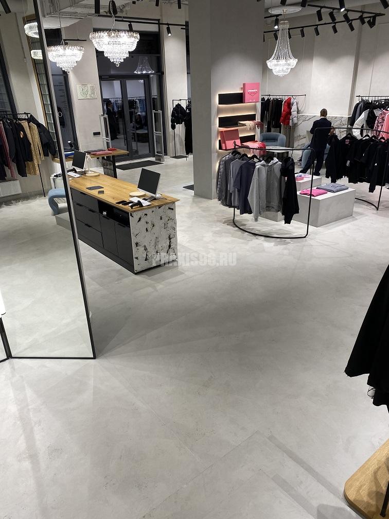 Кассы и полы из микроцемента площадью 330 кв.м.в спортивном магазине “PuncherStore” в ТЦ “SilaVoli”. Кассы собранны из ламинированного дсп и покрыты микроцементом под состаренный бетонный монолит.