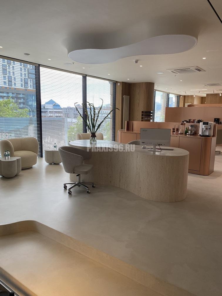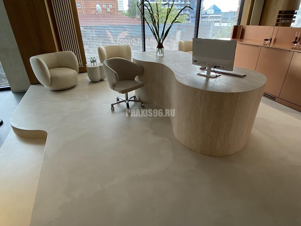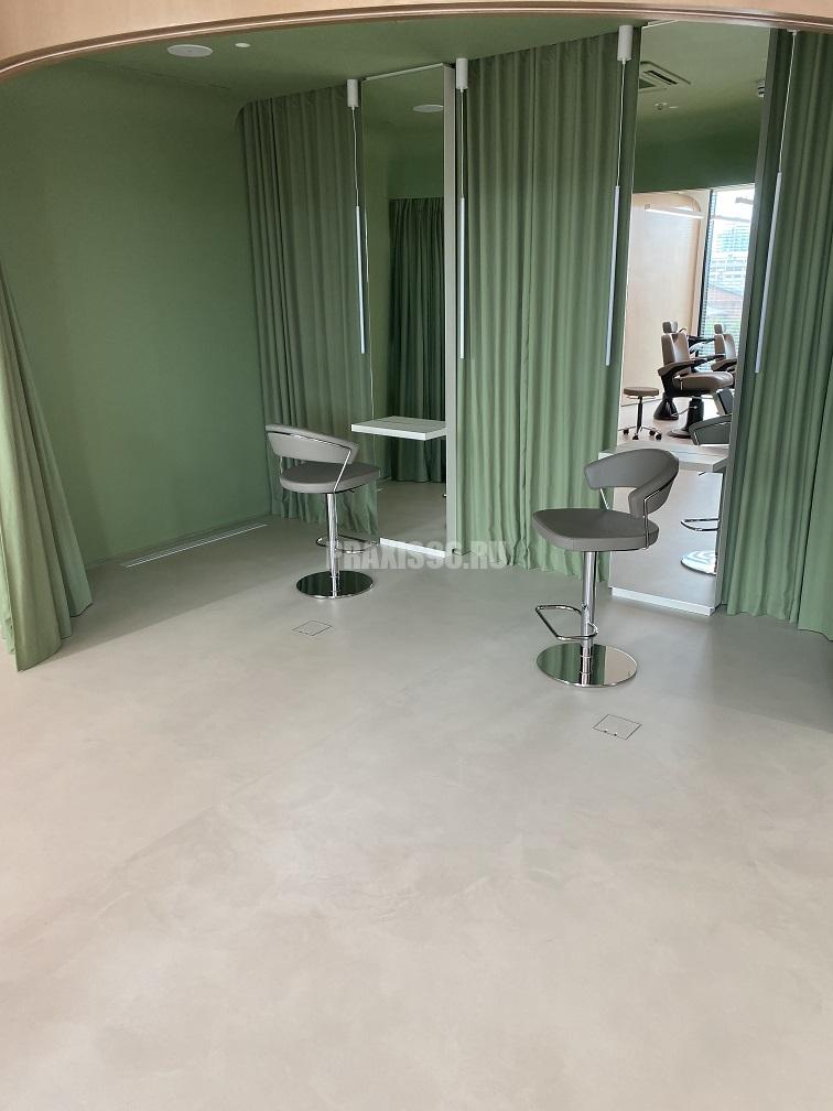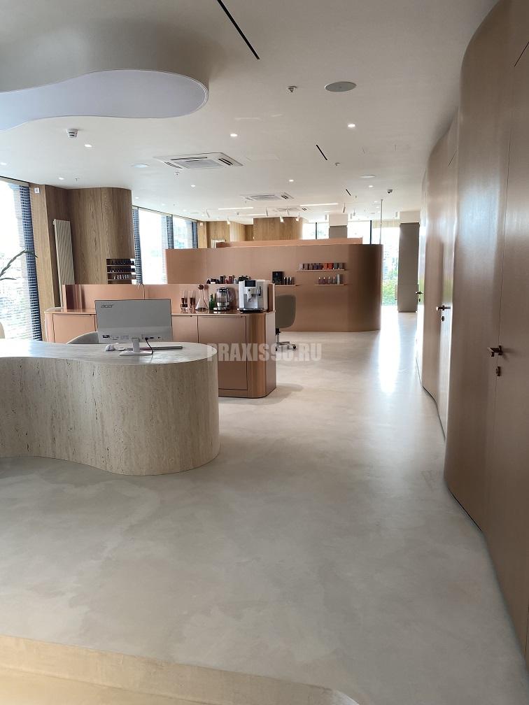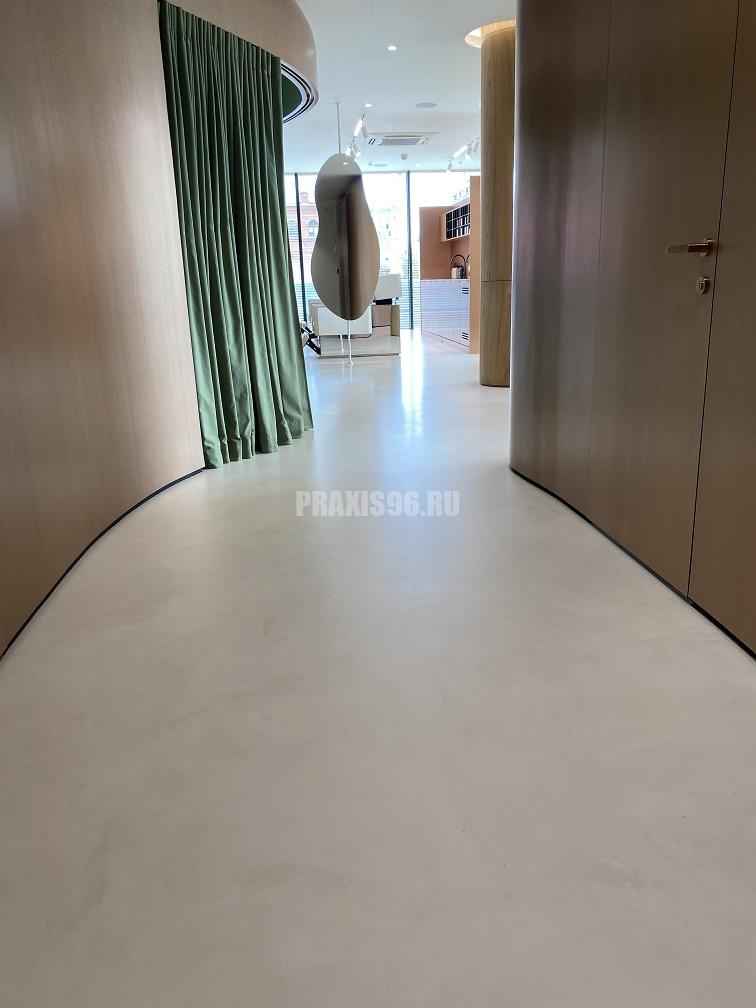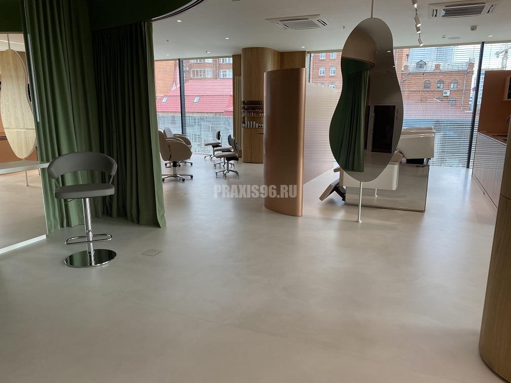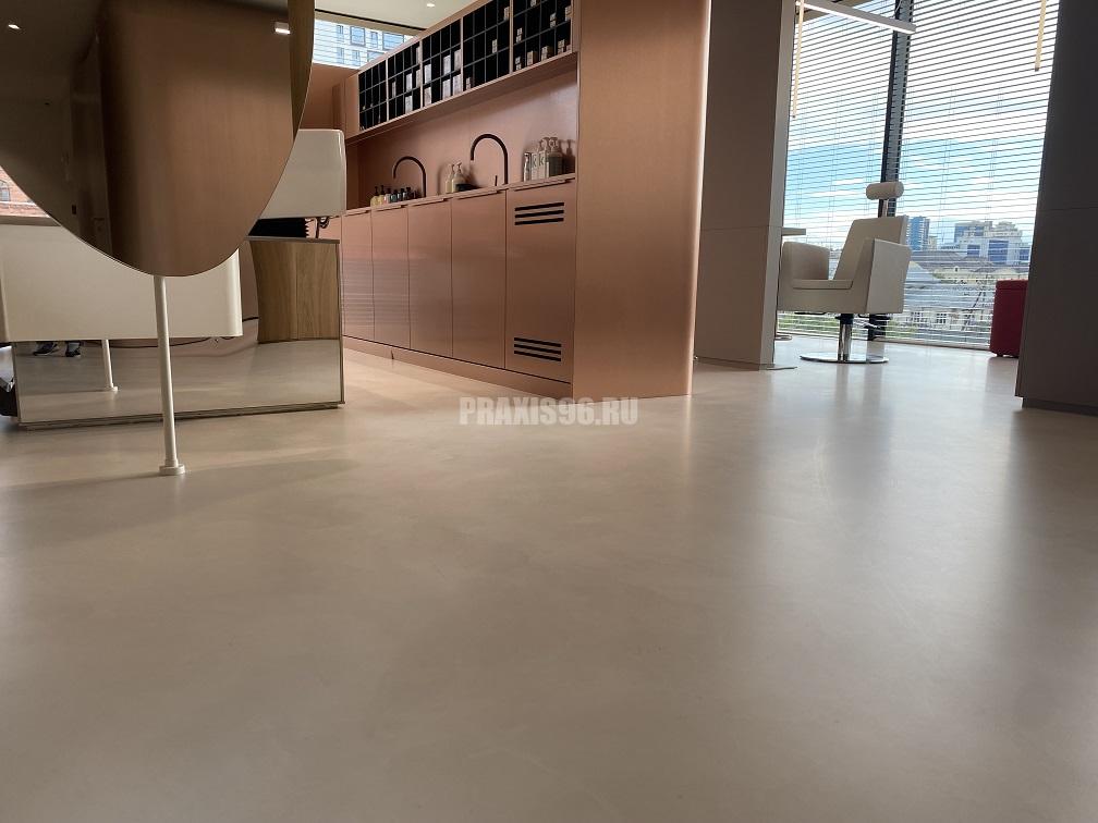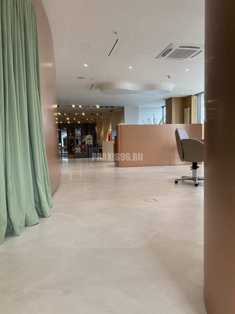 Пол из микроцемента кремового цвета в салоне красоты ТЦ “Покровский”. Покрытие выполненно по фанерному основанию с заливкой прозрачным лаком.